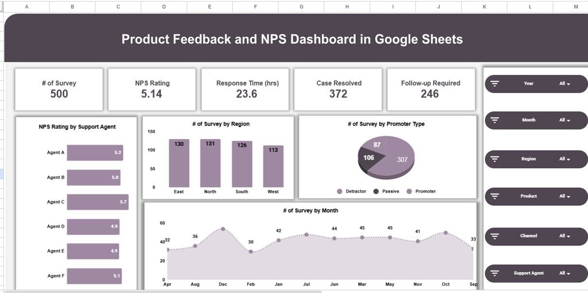 The Overview page is the main command center. It displays 5 KPI cards at the top — Number of Surveys, NPS Rating, Response Time (hrs), Cases Resolved, and Follow-up Required — followed by 4 charts. NPS Rating by Support Agent shows which agents consistently score high or low. Number of Surveys by Region reveals geographic engagement patterns. Number of Surveys by Promoter Type breaks responses into Promoters, Passives, and Detractors. Number of Surveys by Month tracks volume trends across the year. Multiple slicers at the top let you filter all charts at once.Product Feedback and NPS Dashboard in Google Sheets