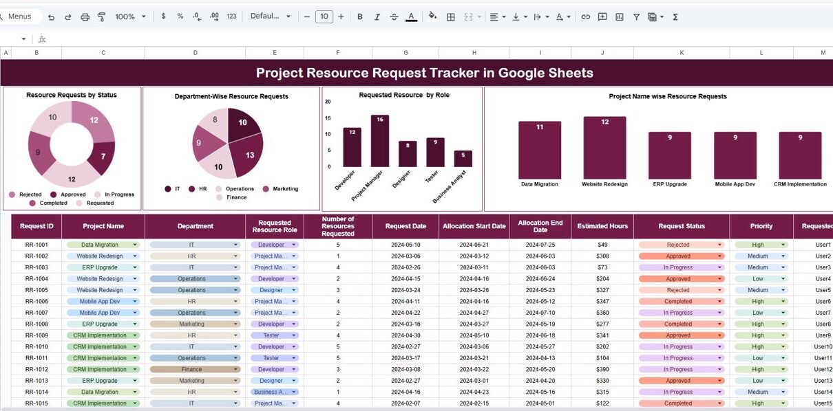 A Project Resource Request Tracker in Google Sheets is a structured and interactive system used to log, track, and analyze project-wise resource requests in one centralized file. Instead of manually reviewing emails or disconnected sheets, teams can monitor all requests through dashboards, charts, and searchable tables.