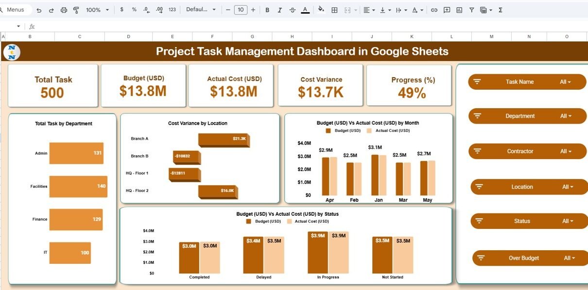 Built entirely in Google Sheets, this dashboard automatically updates charts, calculates variances, and provides department-wise, contractor-wise, and location-based performance insights.Project Task Management Dashboard in Google Sheets