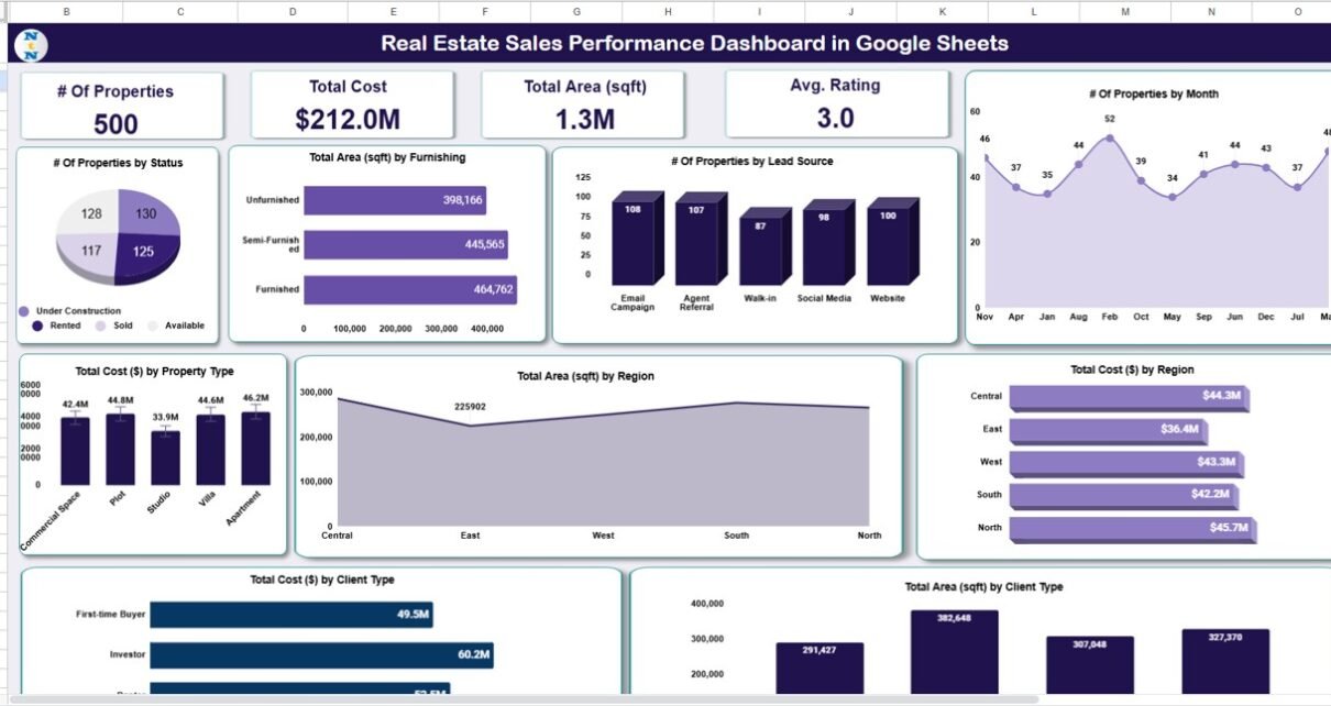 In the fast-paced world of property sales, having clear insights into performance metrics is vital for success. The Real Estate Sales Performance Dashboard in Google Sheets helps real estate professionals, developers, and agencies track property sales, costs, area utilization, client types, and regional performance—all in one interactive, easy-to-use platform.Real Estate Sales Performance Dashboard in Google Sheets