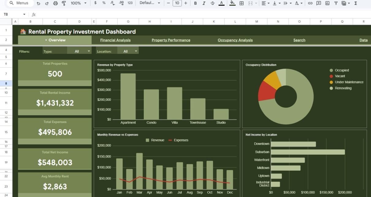 Rental Property Investment Dashboard in Google SheetsRental Property Investment Dashboard in Google Sheets — Overview Page