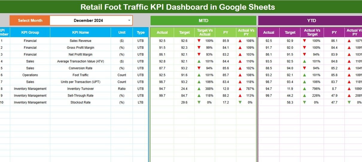 A Retail Foot Traffic KPI Dashboard is a performance monitoring tool designed to measure and analyze customer visits to retail stores. It tracks daily, monthly, and yearly foot traffic and compares performance against targets and previous year data.Retail Foot Traffic KPI Dashboard in Google Sheets