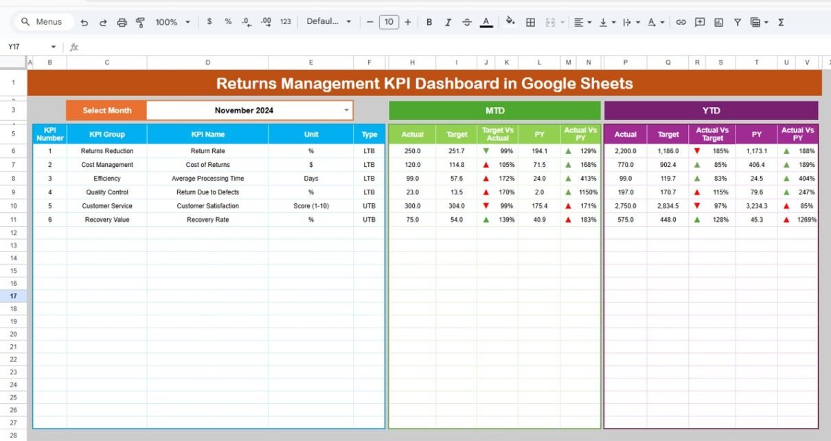 The Returns Management KPI Dashboard in Google Sheets centralizes MTD, YTD, Target vs Actual, and Previous Year comparisons in one powerful system. Moreover, it standardizes KPI definitions and provides visual insights through conditional formatting.