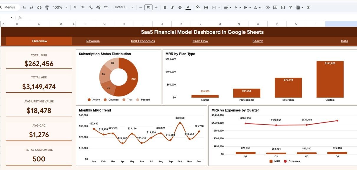 The Overview page is the landing page of the SaaS Financial Model Dashboard. At the top, 5 KPI cards provide high-level metrics at a glance: Total MRR shows your aggregate monthly recurring revenue, Total ARR displays the annualized figure, Avg Lifetime Value reveals the average revenue per customer over their entire lifecycle, Avg CAC shows the average cost to acquire each customer, and Total Customers provides the headcount of active subscribers.SaaS Financial Model Dashboard in Google Sheets