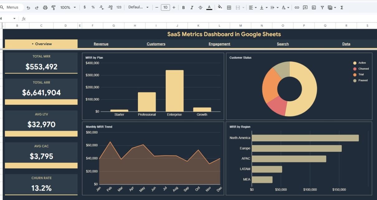 SaaS Metrics Dashboard in Google Sheets is a powerful, cloud-based analytics template designed for SaaS founders, product managers, and subscription business teams who want to track their most critical growth and retention metrics in one place. Whether you are monitoring Monthly Recurring Revenue, analyzing customer churn patterns, or evaluating product engagement scores, this dashboard provides a comprehensive view of your SaaS business health without requiring any desktop software installation.