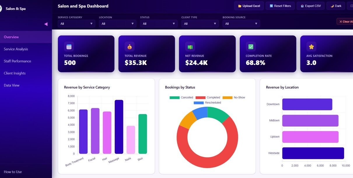 The Salon and Spa Dashboard in HTML is a browser-based analytics template that tracks 5 core KPIs — Total Bookings, Total Revenue, Net Revenue, Completion Rate, and Average Satisfaction — across 5 interactive pages including Overview, Service Analysis, Staff Performance, Client Insights, and Data View.