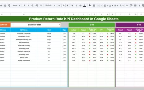 Built entirely in Google Sheets, this dashboard tracks both monthly (MTD) and year-to-date (YTD) performance across multiple research indicators. It includes interactive dropdowns, traffic light indicators, and conditional arrows to show improvement or decline, making it easy to interpret results at a glance.Scientific Research KPI Dashboard in Google Sheets