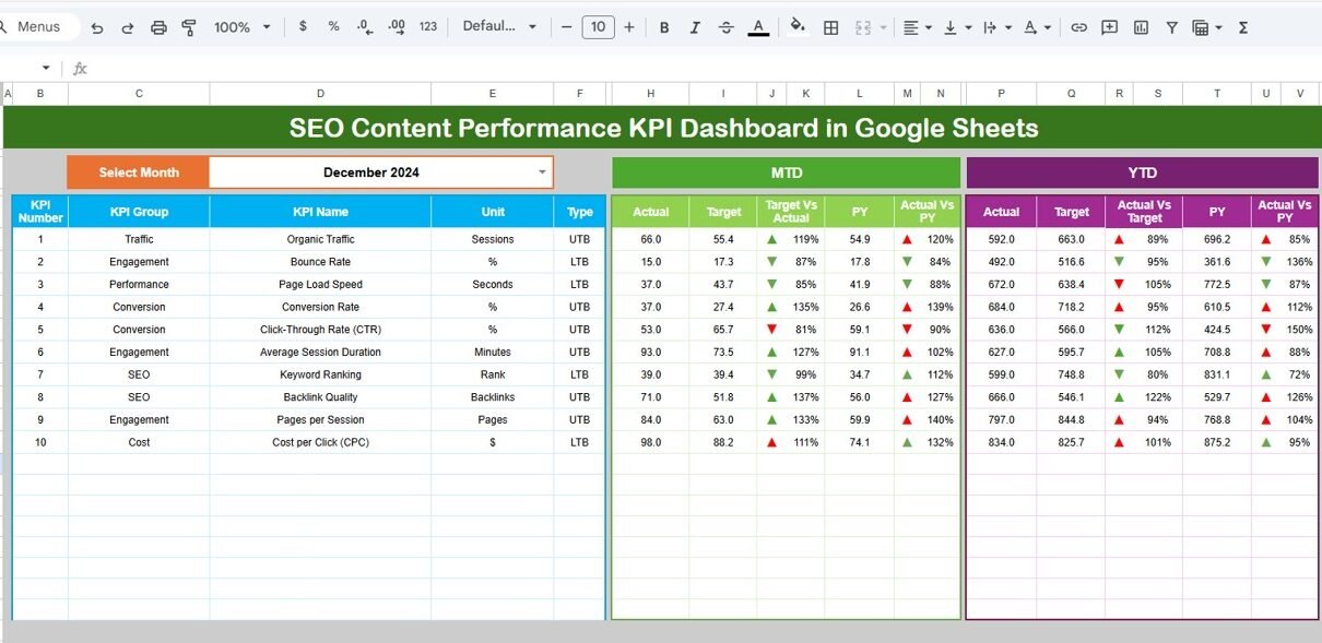 The SEO Content Performance KPI Dashboard in Google Sheets provides a centralized, data-driven solution to monitor SEO metrics, evaluate content effectiveness, and compare performance against targets and previous results. Instead of manually calculating numbers, teams can instantly analyze Monthly-To-Date (MTD) and Year-To-Date (YTD) performance through an automated dashboard.