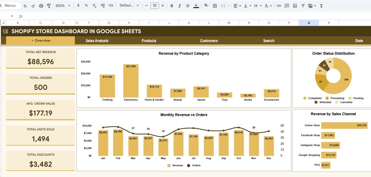 This Shopify Store Dashboard in Google Sheets delivers everything an e-commerce team needs to make data-driven decisions. It includes 6 interactive sheet tabs — Overview, Sales Analysis, Products, Customers, Search, and Data — covering every operational and financial metric that matters for a Shopify business.
