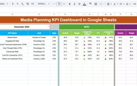 The Social Media ROI KPI Dashboard in Google Sheets is one of the most powerful tools for digital marketers today. It gives you complete visibility into engagement, conversions, costs, traffic, and revenue. Because of its structured design, you can track monthly and yearly progress, compare targets, and review trends easily. With this dashboard, you make better decisions, optimize your content, reduce cost, and improve ROI across all platforms.