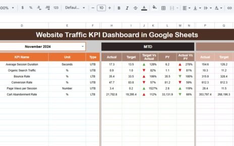 A Software Development KPI Dashboard in Google Sheets is a smart reporting tool that tracks development performance through measurable KPIs. It shows month-wise and year-to-date performance for all development metrics. It updates automatically based on the actual numbers, targets, and previous-year data that you enter.