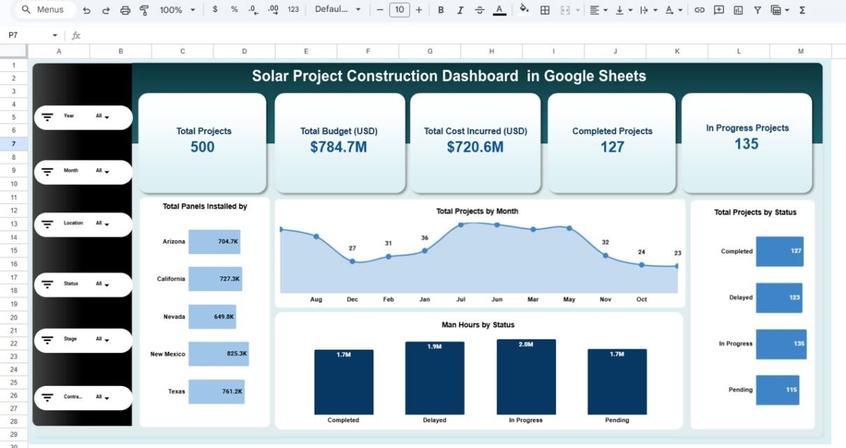 Let’s explore everything in detail.Solar Project Construction Dashboard in Google Sheets