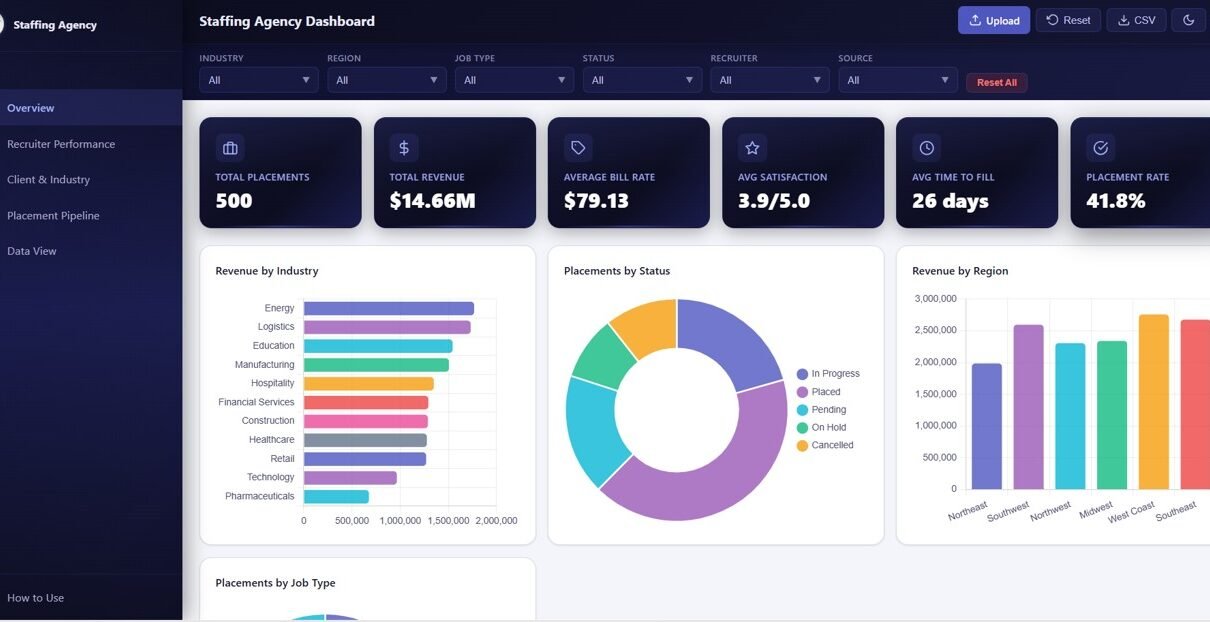 The Overview page serves as the central command center of the Staffing Agency Dashboard. At the top, you’ll find 6 KPI cards that provide a high-level snapshot of your agency’s performance: Total Placements, Total Revenue, Average Bill Rate, Avg Satisfaction, Avg Time to Fill, and Placement Rate.