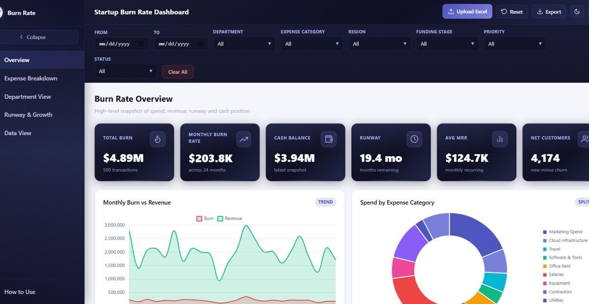 Startup Burn Rate Dashboard in HTML is a ready-to-use, browser-based interactive analytics template designed for startup founders, CFOs, finance managers, investors, and accelerator programs who need instant visibility into cash burn, runway, revenue growth, expense breakdown, and department-level spending. This dashboard delivers 5 interactive pages, 6 executive-level KPI cards, and over 12 dynamic charts — all running directly in your web browser without any software installation.