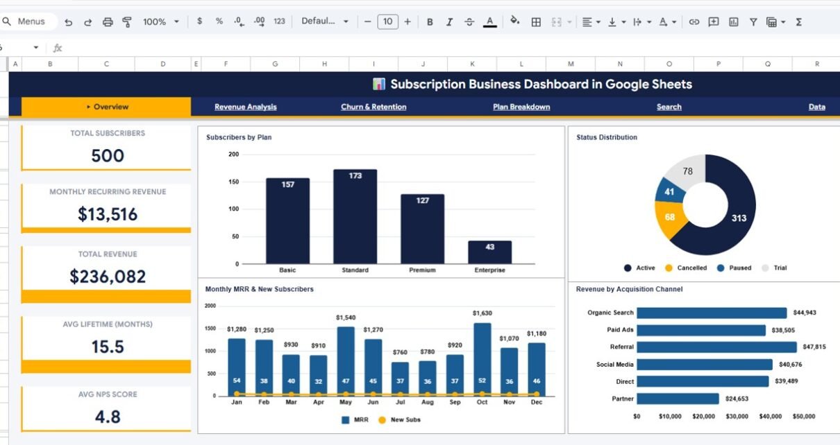 Subscription Business Dashboard in Google Sheets - Overview Page