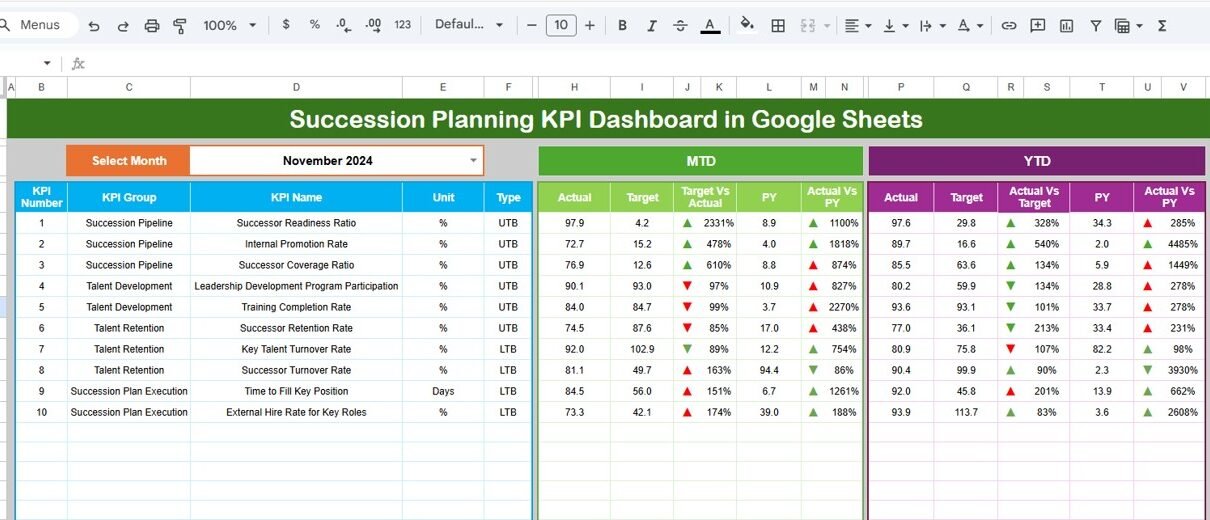 This ready-to-use dashboard helps organizations track all critical succession planning KPIs in one place. It converts raw HR data into clear insights using MTD, YTD, targets, previous-year comparisons, and trend analysis. Moreover, because it is built in Google Sheets, it is easy to use, flexible, and accessible from anywhere.
