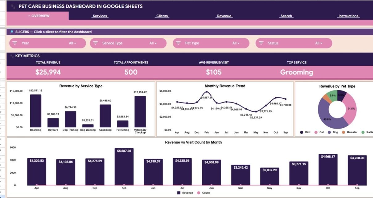 Pet Care Business Dashboard in Google Sheets — track revenue, appointments, services, clients & staff performance across 6 interactive pages with slicers and search.