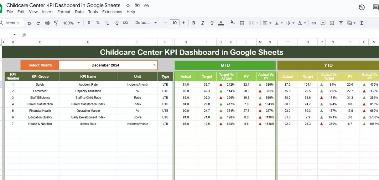 Childcare Center KPI Dashboard in Google Sheets