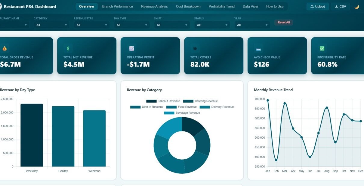 Track restaurant revenue, food cost, labor cost, and profit across multiple locations with this interactive Restaurant P&L Dashboard in Google Sheets featuring 6 pages, 13+ charts, and built-in search.