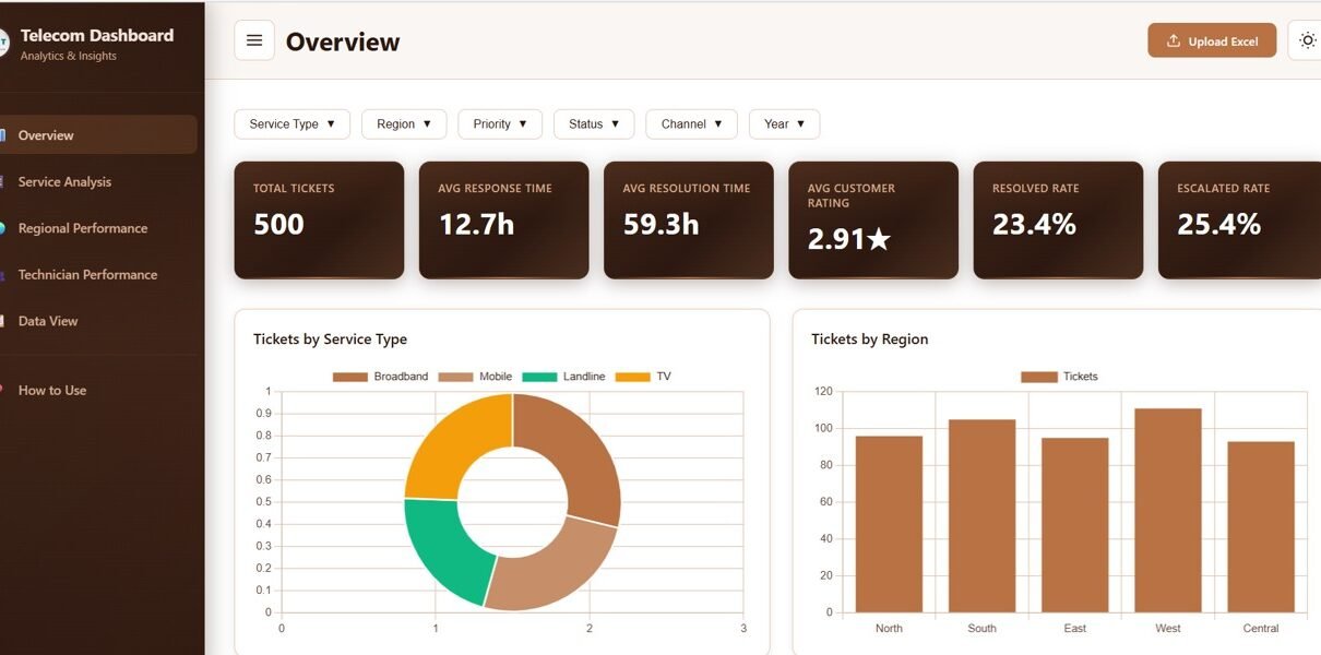 This dashboard is ideal for telecom operations managers, customer service leaders, regional managers, technician supervisors, business analysts, and telecom consultants who need clear visibility into support performance data.