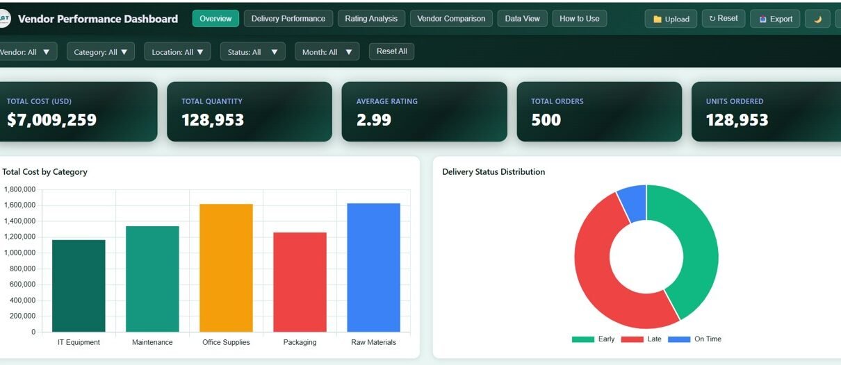 The Vendor Performance Dashboard in HTML is a powerful, interactive, and ready-to-use analytics tool that transforms complex vendor data into clear, actionable insights. With 5 dedicated analytical pages, 5 KPI cards, dynamic filtering, and CSV export capabilities, this dashboard equips procurement and supply chain teams with everything they need to monitor vendor costs, delivery performance, quality ratings, and vendor comparisons in one place.