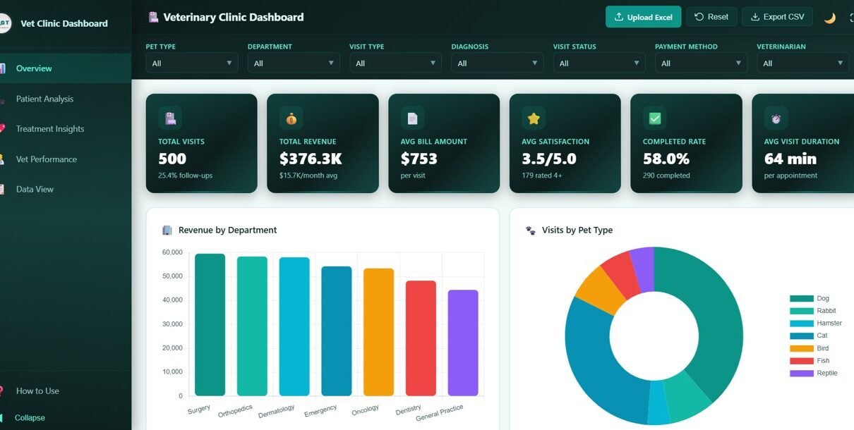 • 5 analytical pages: Overview, Patient Analysis, Treatment Insights, Vet Performance, and Data View.