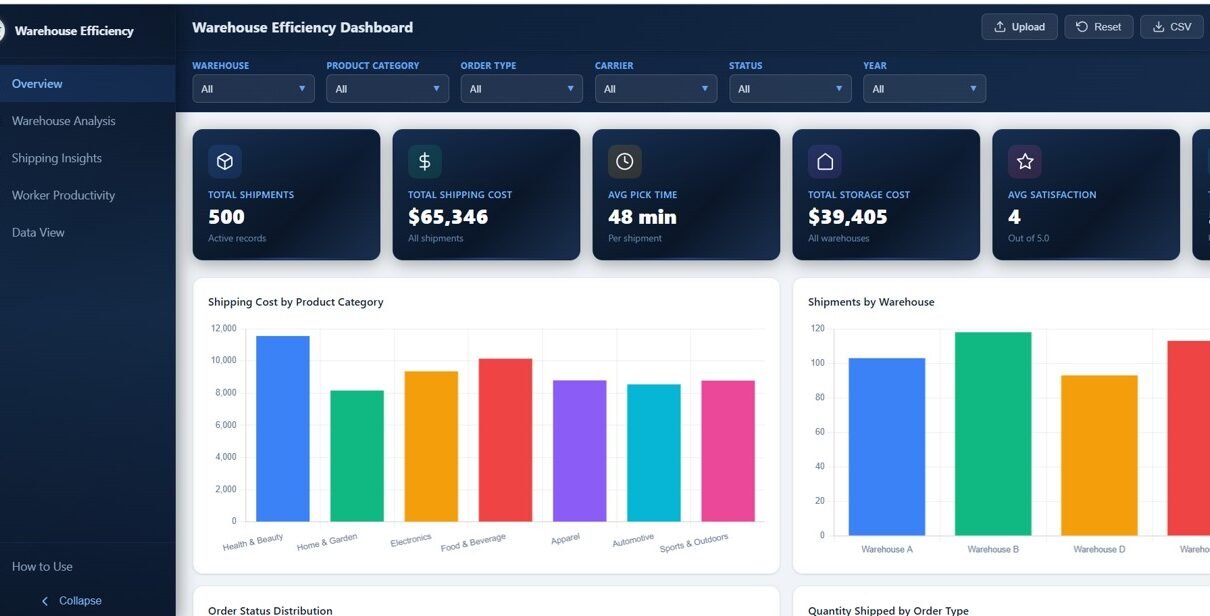 The Overview page serves as the central command center of the Warehouse Efficiency Dashboard in HTML. At the top, you will find 6 KPI summary cards displaying Total Shipments, Total Shipping Cost, Avg Pick Time, Total Storage Cost, Avg Satisfaction, and Total Qty Shipped — giving you an immediate snapshot of warehouse health.