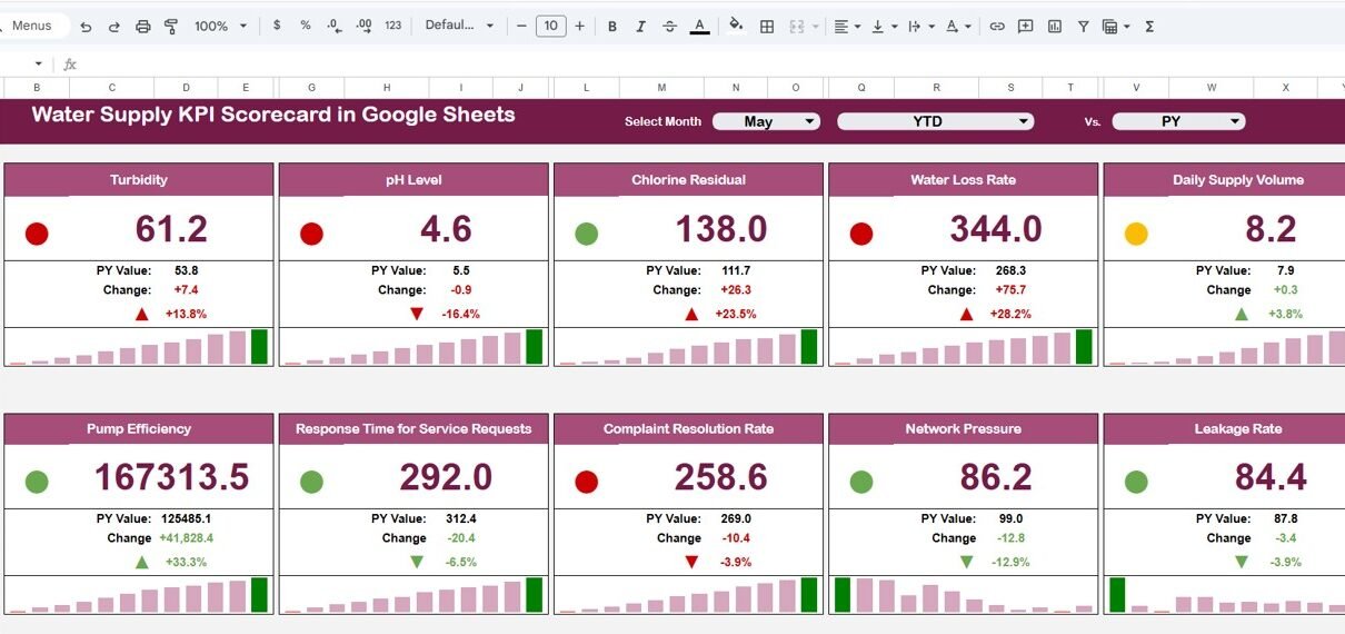 The Water Supply KPI Scorecard in Google Sheets is a powerful and user-friendly tool that simplifies performance tracking for water utilities. It transforms raw data into meaningful insights using interactive visuals and indicators.