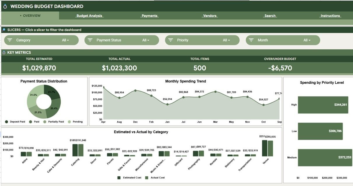 - 18+ Dynamic Charts — Payment Status Distribution by Status, Monthly Spending Trend by Month, Spending by Priority Level, Estimated vs Actual by Category, Avg Estimated by Wedding Items, Top Sub-Categories by Spend, and more.