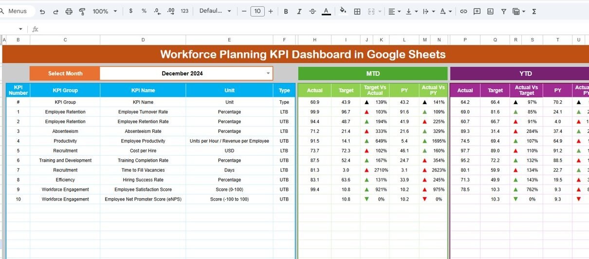 The Workforce Planning KPI Dashboard is a Google Sheets–based tool designed to track key workforce indicators, including: